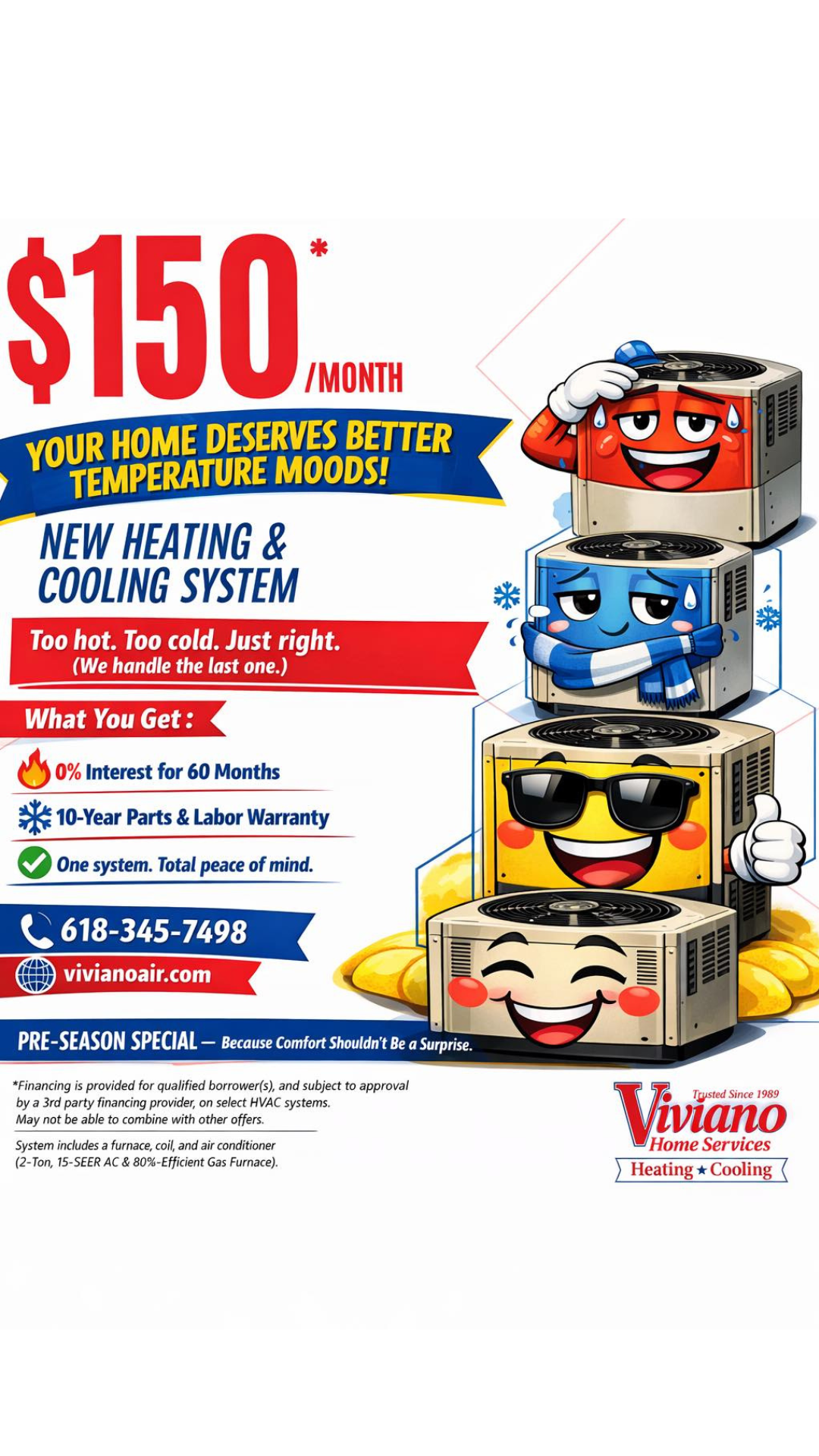 Throughout the year, Viviano Heating and Air Conditioning has offers and discounts for our valuable customers. Whether you are in need of a complete, new system or need top A/C repair in Illinois, it’s easy to schedule a service or maintenance call with Viviano. Listed as one of the top air conditioner installation companies in the area, we look forward to troubleshooting your existing system or answer any questions about our wide variety of A/C installation services. Give us a call to learn more at (618) 345-7498.