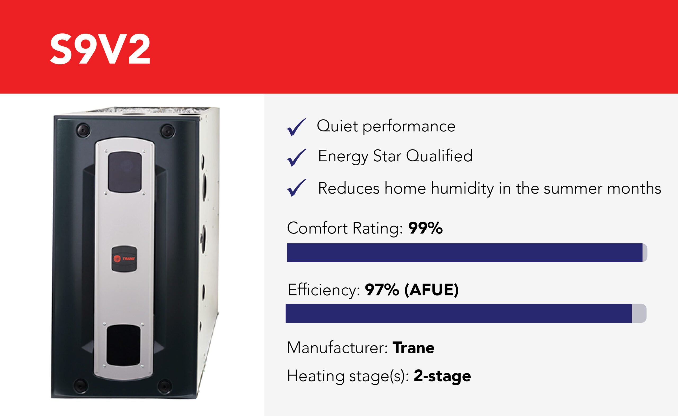The S9V2 is rated at 96% gas efficiency (AFUE), and the Vortica™ II blower is one of the most efficient in the industry, providing energy savings in both winter AND summer.
